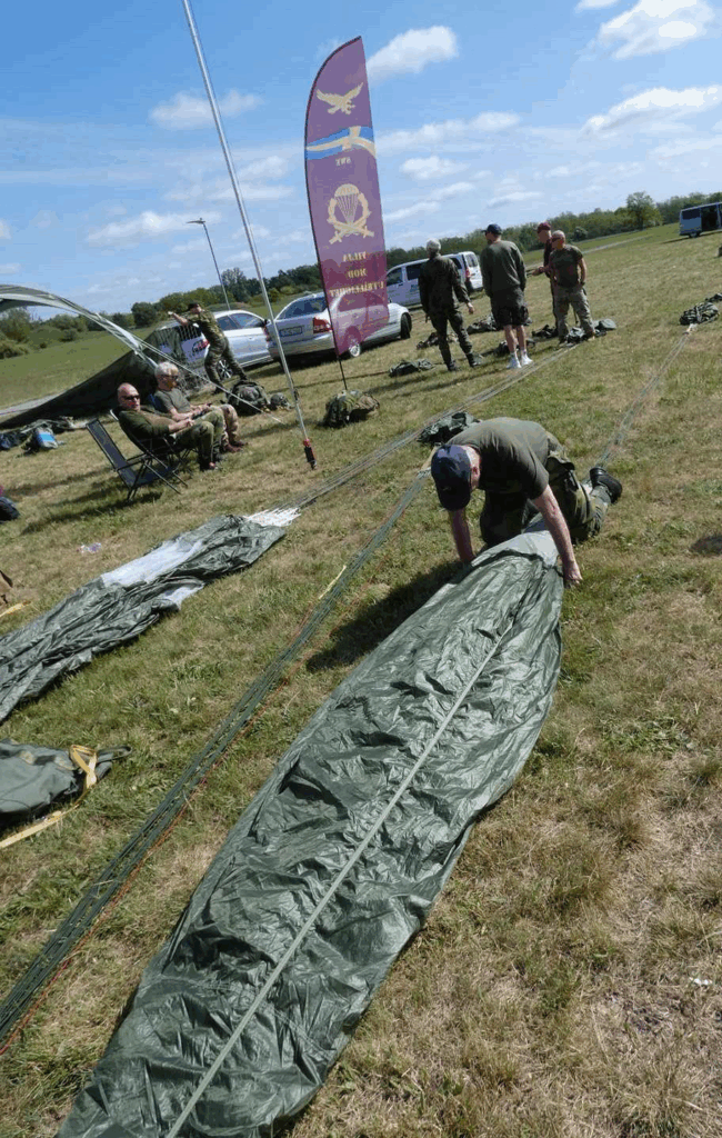 Ebenfalls wieder dabei und für umfangreiche Unterstützung in der Ausführung bereit, Thomas Keller und Jörg Siebert. Beide sind sehr eng mit dem Springen des Rundkappenschirmes vertraut, der nur noch eine Ausnahmeerscheinung im militärischen Fallschirmspringen darstellt. Von den regulären Armeen nicht mehr genutzt. (Anmerkung TF.: In der Bundeswehr wird seit Frühjahr 2024 Schritt für Schritt der alte T-10-Schirm durch das neuen Automatik-Fallschirmsprungsystem EPC-B abgelöst. Neues Automatik-Fallschirmsprungsystem EPC-B in der Truppe)